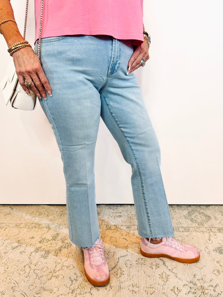 Jeanne mid rise raw cut hem flare jeans in a stylish misty cloud. These cropped jeans are perfect for any lifestyle, featuring a raw cut hem with a modern finish that adds an edge to your look. Crafted with high-quality material, these jeans offer just the right amount of stretch for all-day wearability.