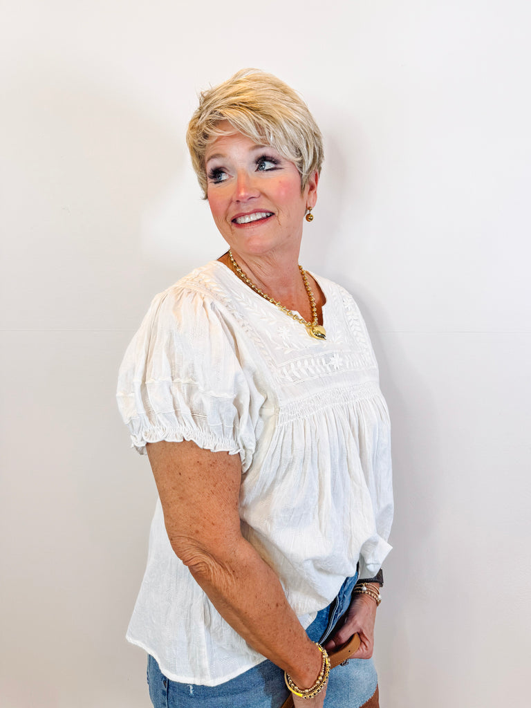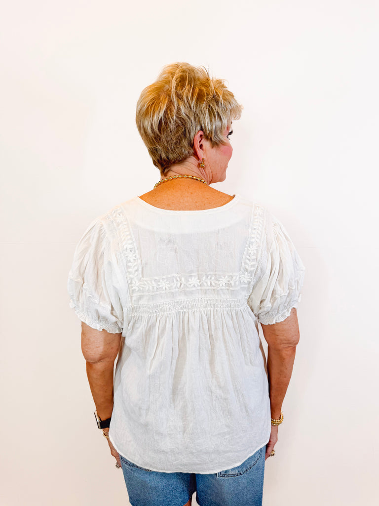 White puff sleeve top with delicate embroidered details. Romantic and versatile, perfect for any occasion.