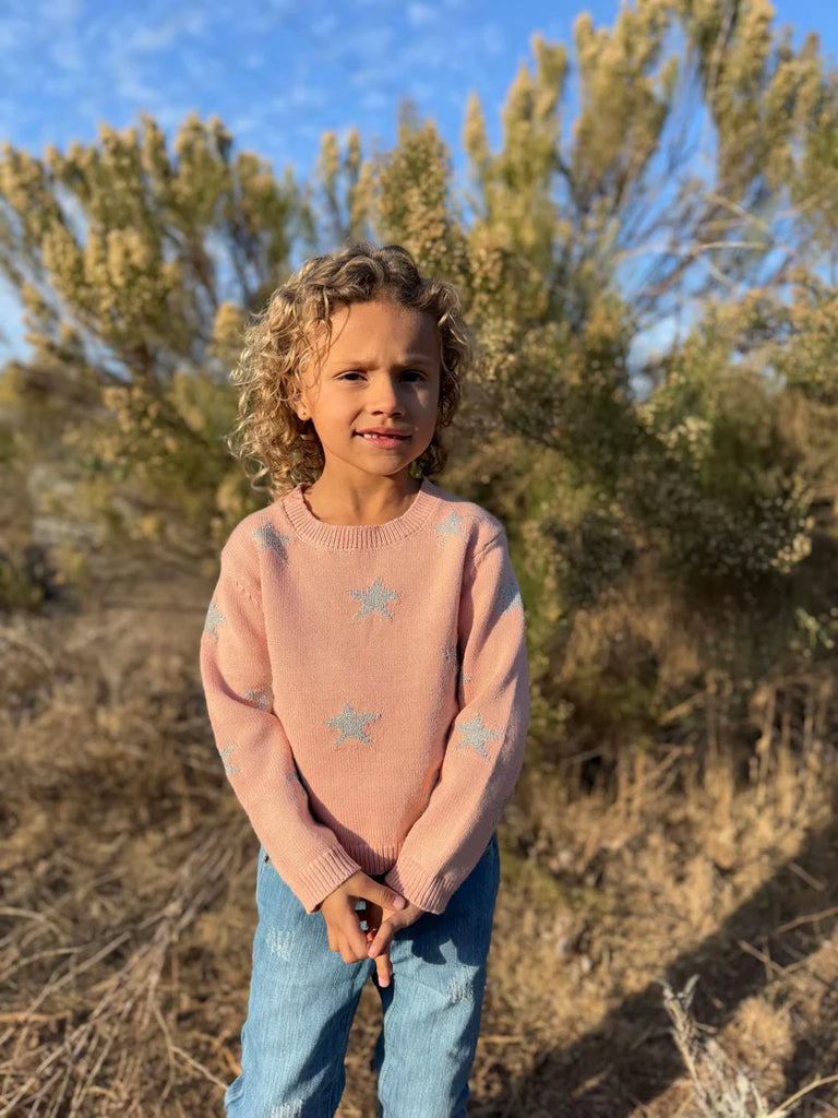 Cozy up in the Robyn Sweater from Vignette, a playful twist on your kiddos favorite knitwear. Soft pink fabric is sprinkled with shimmering silver stars, bringing a touch of whimsy to chilly days. Perfect for adding sparkle to casual outfits while keeping them comfortably warm.