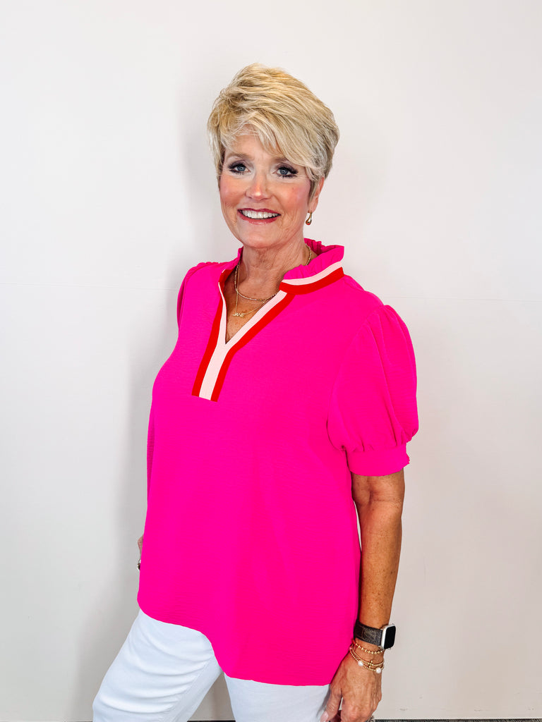 A vibrant fuschia top featuring a charming ruffled collar. Perfect for adding a pop of color and feminine detail to your everyday wardrobe. Versatile enough to dress up or down, this piece works for any occasion.