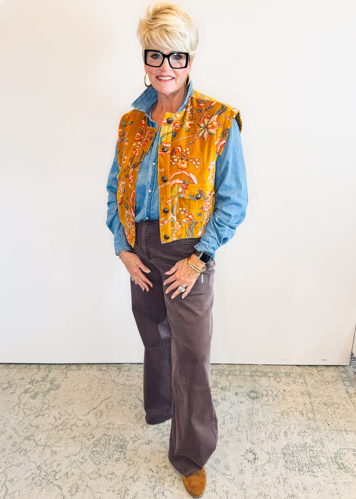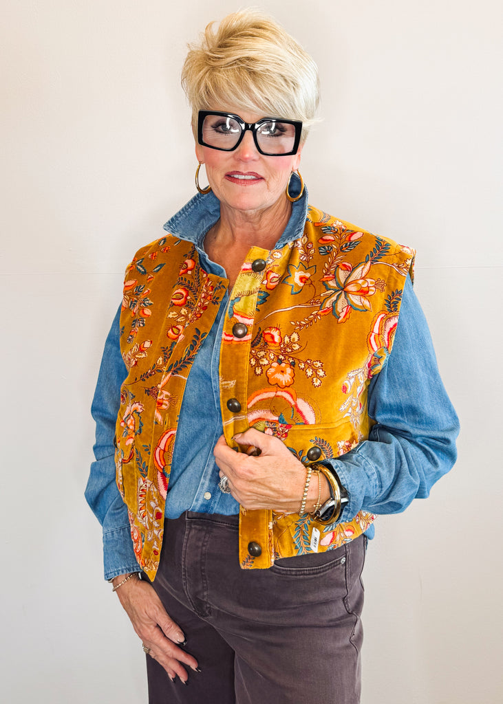 This Gold Velveteen Vest blends vintage charm with modern style, making it a versatile layering piece. The soft velveteen fabric in warm gold pairs effortlessly with dresses, blouses, and casual tops, adding refined elegance to any look.