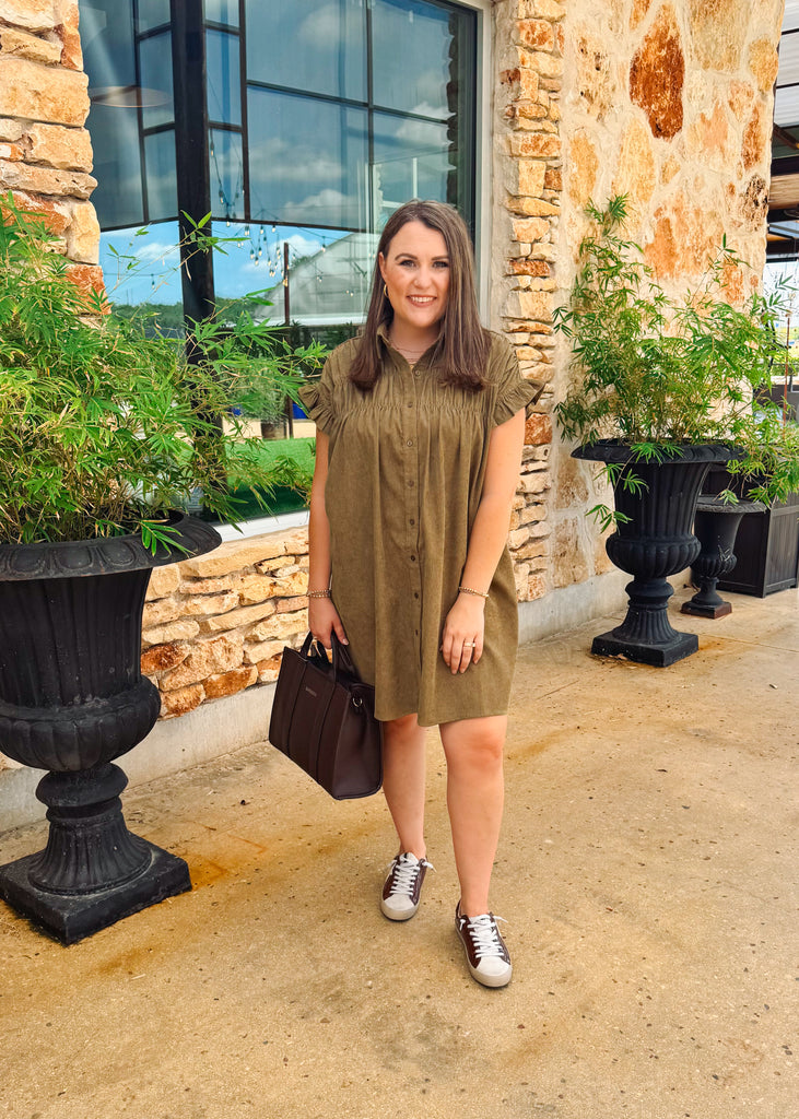 The Kirstin Woven Dress in Khaki is a blend of style and comfort. With a smocked chest and functional buttons running all the way down, this mediumweight dress offers a relaxed, boxy fit that’s perfect for easy, everyday wear.