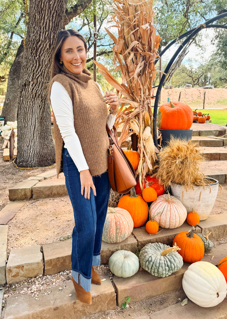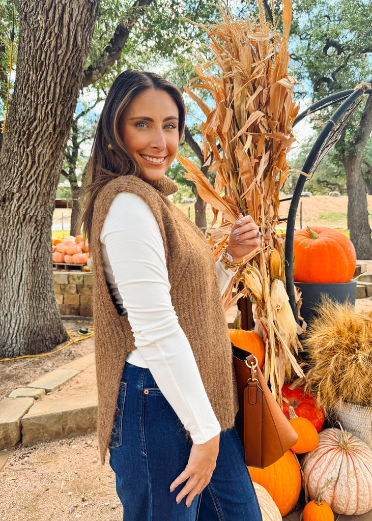Stay cozy and stylish in our Knitted Sleeveless Sweater! Featuring a turtle neck and heavy weight design, it's perfect for chilly days. The side seam connects the front and back pieces for a unique touch.