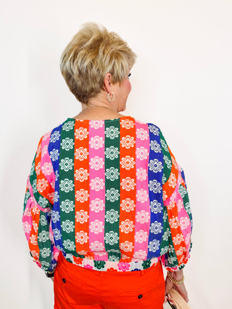 A cheerful jacket bursting with colorful daisy patterns. Perfect for layering and spreading smiles wherever you go!