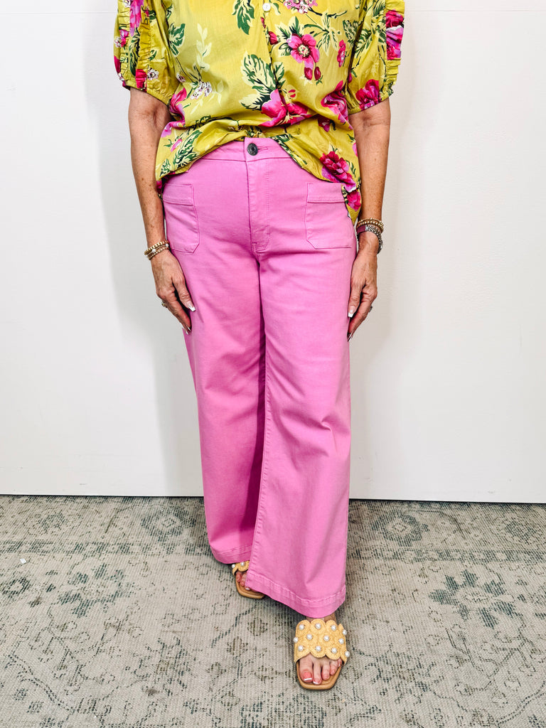Make a bold statement in these high-rise wide leg pants, featuring a clean, tailored look with a defined wide leg silhouette. The flattering high rise fit enhances your shape, while functional patch pockets add a modern, on-trend touch. Crafted from very stretchy material for all-day comfort and flexibility, this vibrant pop color style adds the perfect accent in styling to elevate any outfit.