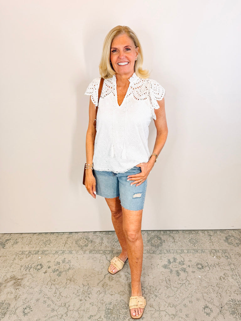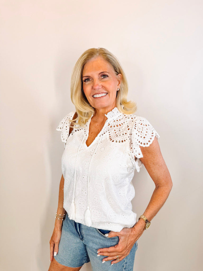 White eyelet ruffle top with delicate lined construction for comfort and durability. Features a flattering V-neckline, adjustable tie detail at the neck, and charming ruffle sleeves that add movement and dimension. Perfect for warm weather styling with its breathable fabric and feminine silhouette.