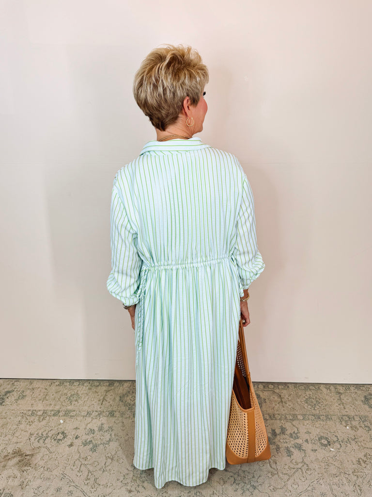 Effortlessly chic and comfortable, this preppy kaftan features a soft light pink base with crisp green and white stripes. The flattering V-neckline and collar create a polished look, while long sleeves offer versatility for any season. Fully lined for a refined drape, the adjustable waist ensures a perfect fit for all sizes, and the ankle slit adds movement and style. Perfect for lounging by the pool, travel, vacation, or any summer day.
