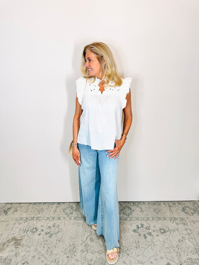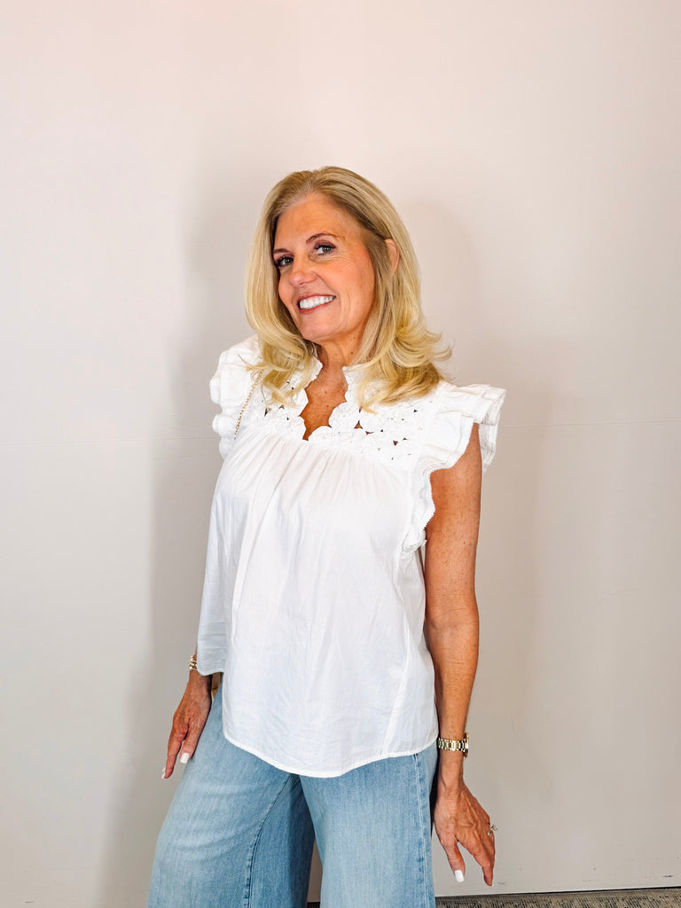 This breezy top features an intricately detailed yoke that adds just the right amount of visual interest, paired with delicate ruffled sleeves and neckline. Crafted from 100% cotton, it's breathable, comfortable, and built to last.