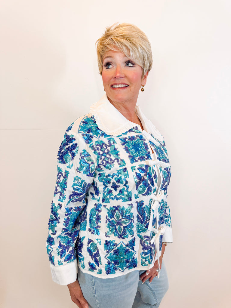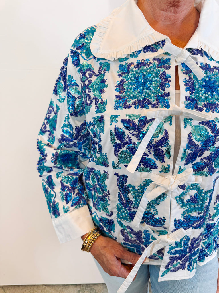 The playful tie-front neckline adds a flirty touch, while the standout fun collar frames your face beautifully. Adorned with a stunning sequin blue and white Italian tiles design, this long-sleeve top transforms a classic silhouette into a conversation starter. A versatile piece that proves timeless elegance and playful personality can absolutely coexist.