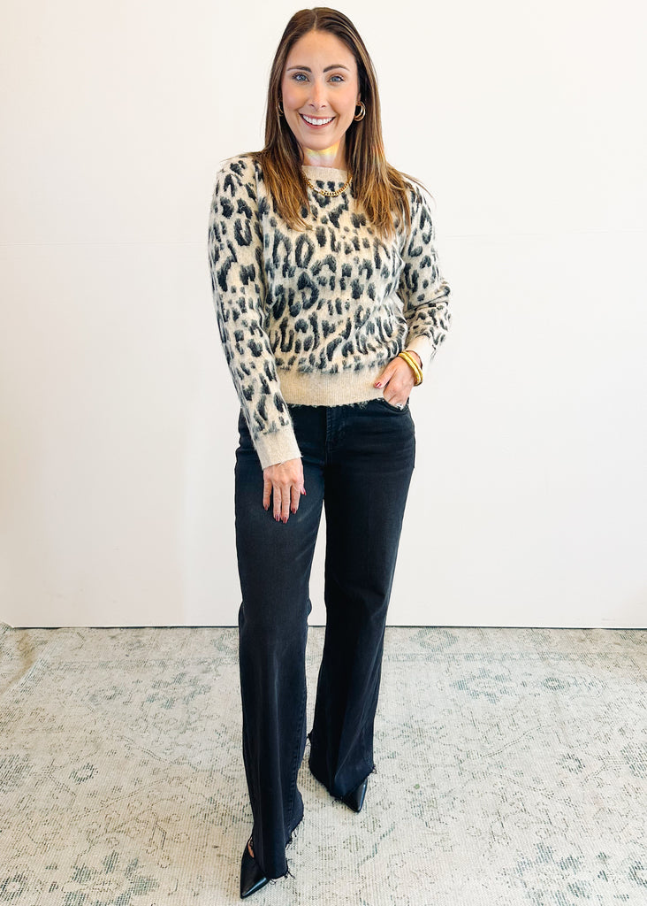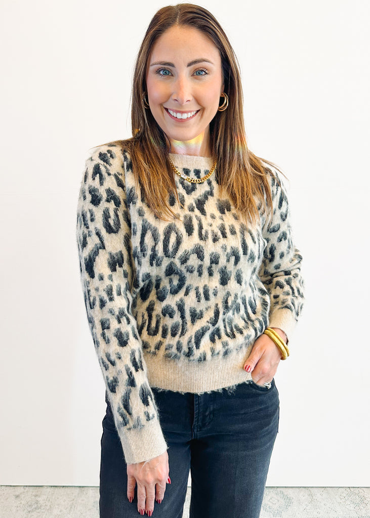 Mina long sleeve leopard print sweater, crafted with a blend of premium yarn. Timeless crew neck is effortlessly chic and versatile, offers warmth and style that's perfect for layering. The snow leopard design adds a unique statement to any outfit, the highlight of any crowd.