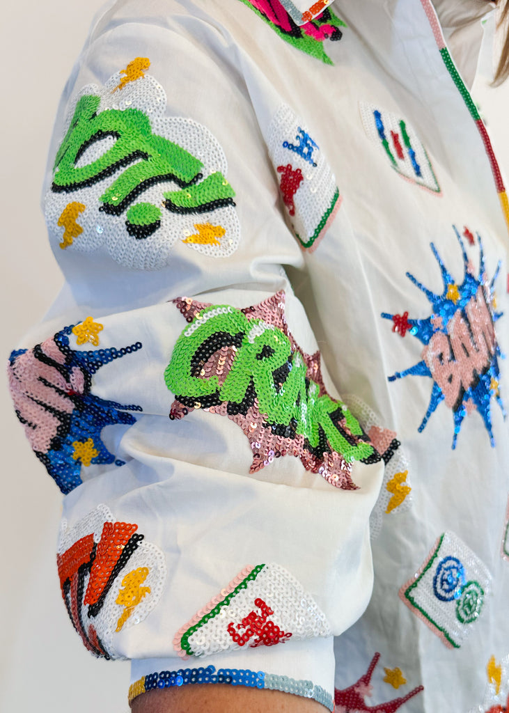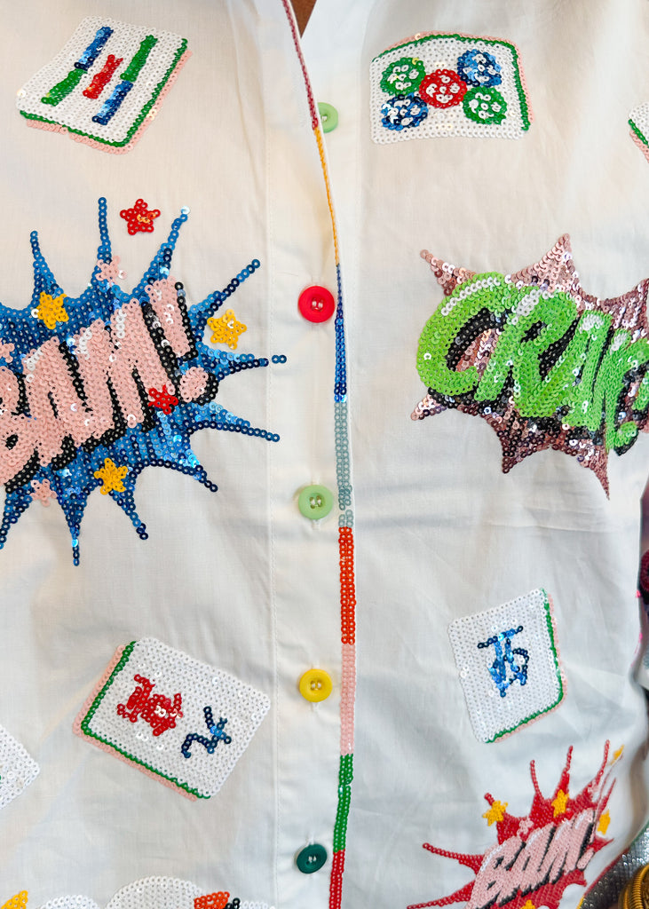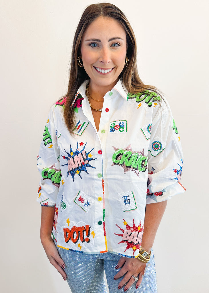 Brighten your wardrobe with this cheerful white poplin button-up featuring vibrant rainbow mahjong characters scattered throughout. Playful and packed with personality, this generous-fitting top celebrates the beloved tile game in colorful style. Perfect for anyone who loves a conversation starter with their fashion. Model shown wearing XS.