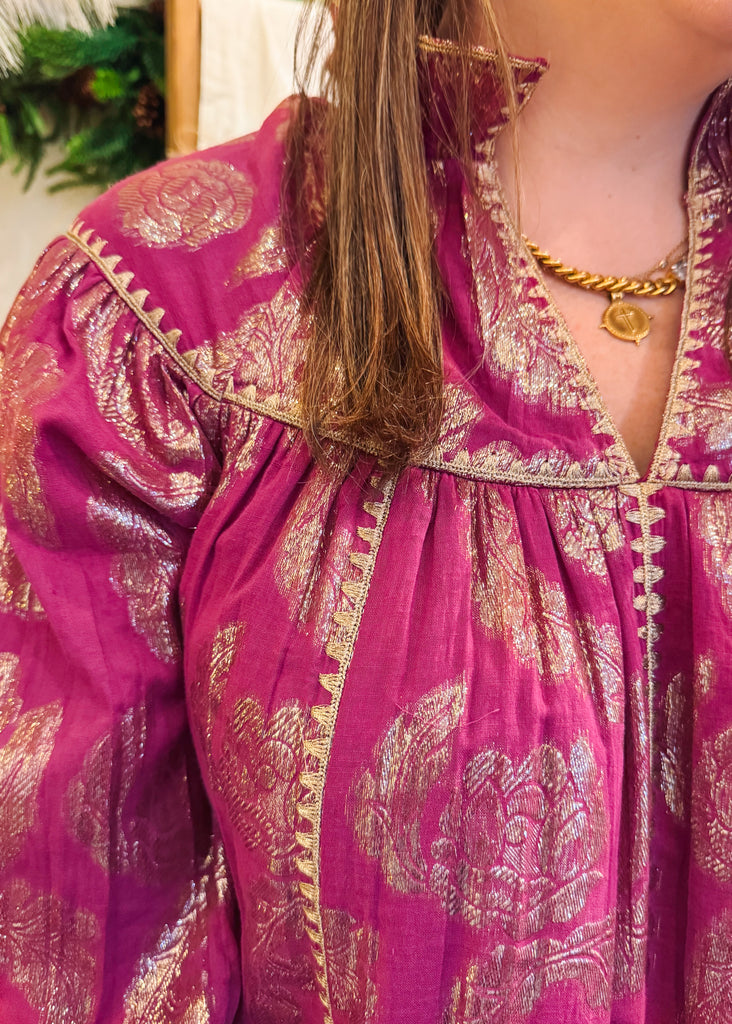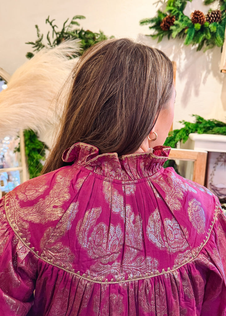 Twirl into any occasion in this delightfully flowy swing dress! Crafted in a rich deep raspberry hue with shimmering metallic accents woven throughout, it's a showstopper that catches the light with every movement. The fully lined bodice ensures comfort and confidence, while the unlined arms keep things breezy and effortless. That gorgeous tiered silhouette? Pure magic for dancing, swaying, and making an entrance