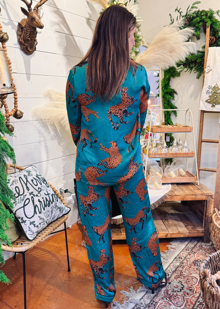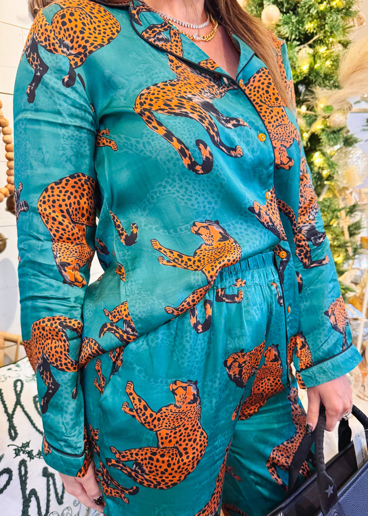 Elevate your loungewear with a touch of playful sophistication. Crafted from silky-smooth fabric, this jade-green pajama set features a bold all-over cheetah print in rich amber tones — a striking contrast that exudes effortless glamour. The relaxed shirt is cut with a classic notched collar and button front, perfectly paired with wide-leg drawstring trousers for all-day comfort. Whether you're unwinding at home or styling it as a statement co-ord for brunch, this set brings luxurious ease to every moment.
